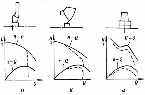 對于低比轉(zhuǎn)速,由于葉片間流道窄而長,一旦發(fā)生汽蝕,氣泡充滿整個流道,性能曲線會突降。